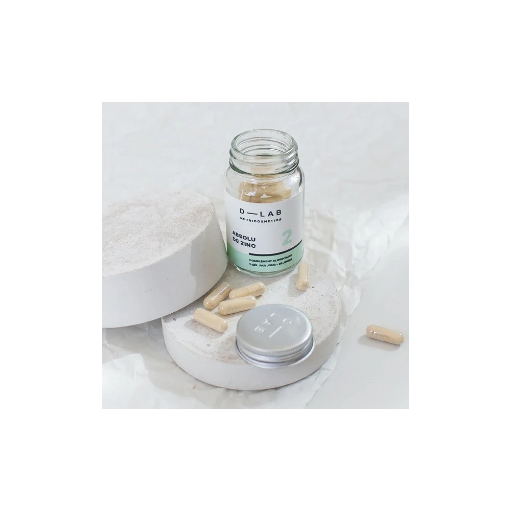 Le complément alimentaire ABSOLU DE ZINC de la marque D-LAB nutricosmetics est un composant majeur de la peau qui améliore la qualité de la peau & des cheveux.