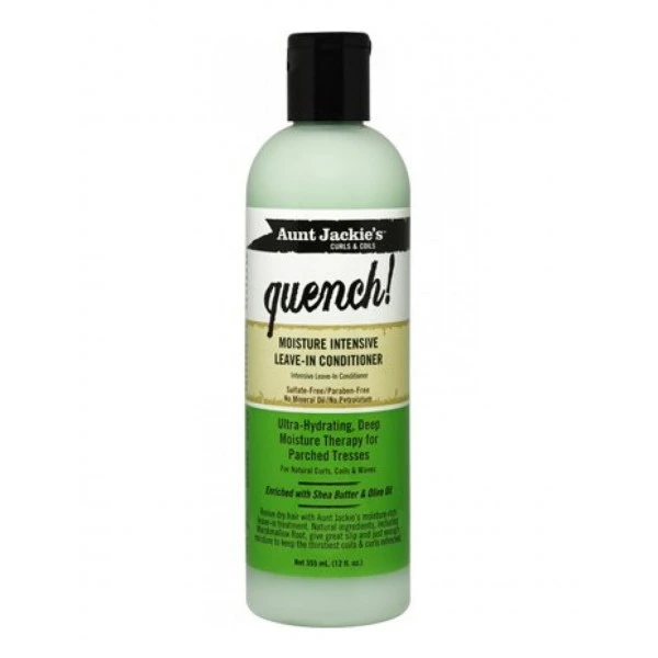 Le conditionneur sans rinçage QUENCH de la marque AUNT JACKIE’S hydrate durablement et adoucit les cheveux sans les alourdir.